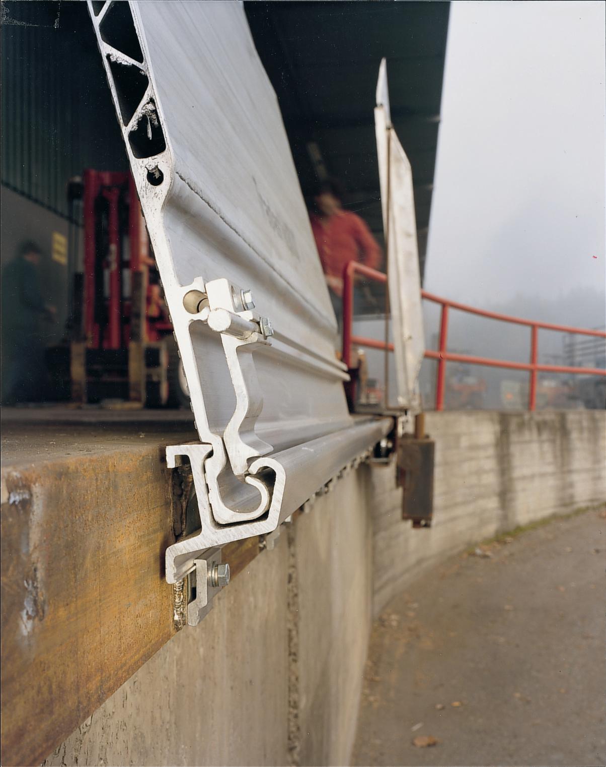 Komfortable Verladung ohne Platzverlust in der Halle. Ideal für Gebäude ohne Rampengrube. Die Schwenkbrücke wird außen an der Betonrampe auf einen tragfähigen Stahlwinkel montiert, sodass der Querverkehr auf der Rampe und in der Halle ungehindert fließen kann. Auch als seitenverschiebbare Variante für mehrere Tore verfügbar.