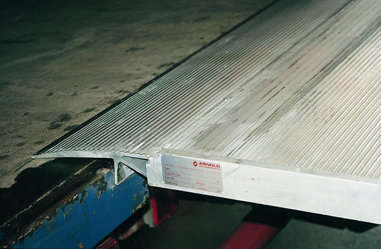Die Standard-Nennlast bei ARNOLD Anpassrampen liegt bei 60 kN (6 Tonnen). Diese Tragkraft ist für die meisten Einsätze mit Elektro-Hubwagen und Gabelstapler ausreichend. Bei extrem schweren Gütern oder hoher Umschlagfrequenz an der Rampe empfehlen wir jedoch eine verstärkte Ausführung mit 100 kN (10 Tonnen) Traglast. Es sind auch Sonderausführungen bis 200 kN möglich. Die in Ruheposition senkrecht stehenden Überladebrücken, wie Verladebrücken aus Aluminium, haben Tragkräfte von zumeist 30 bis 50 kN.